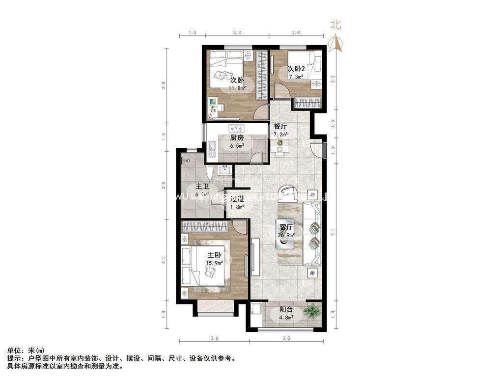 厅室3室2厅1卫1阳台