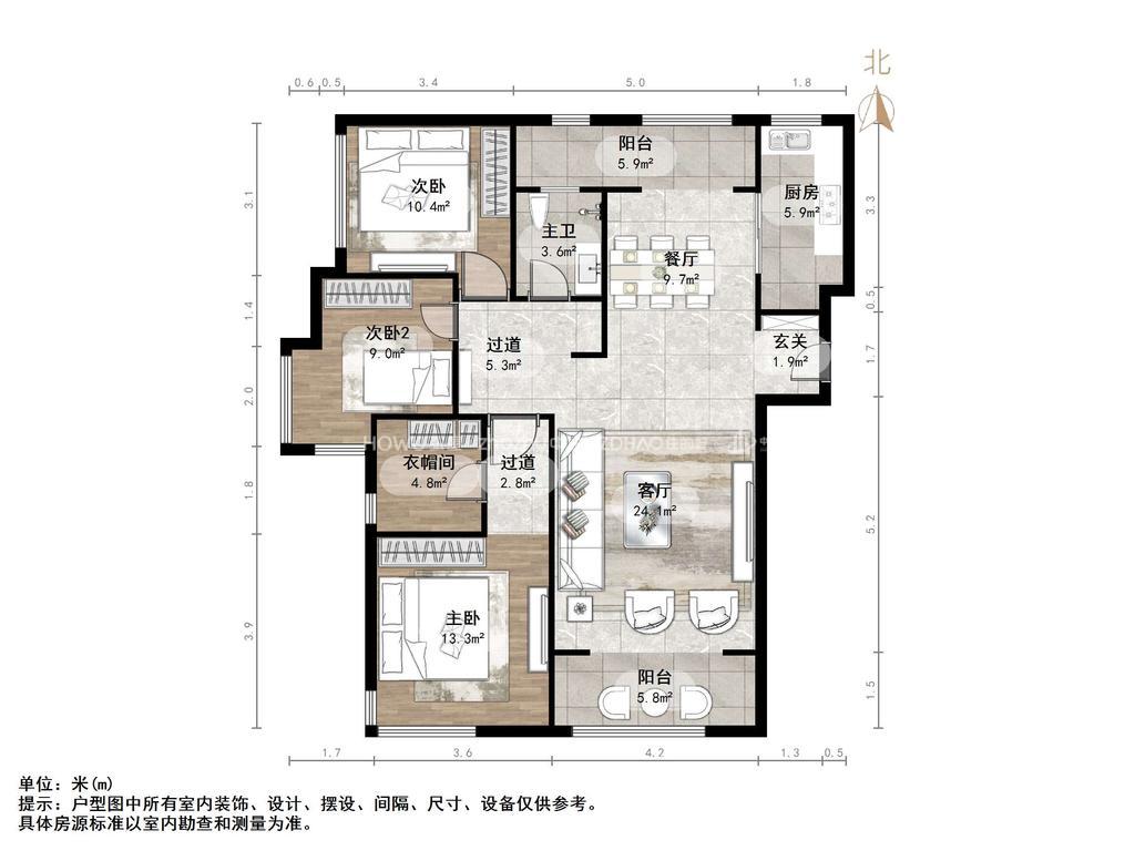 厅室3室2厅2卫1阳台