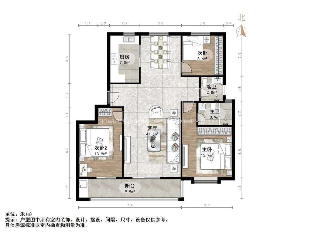 厅室3室2厅2卫1阳台