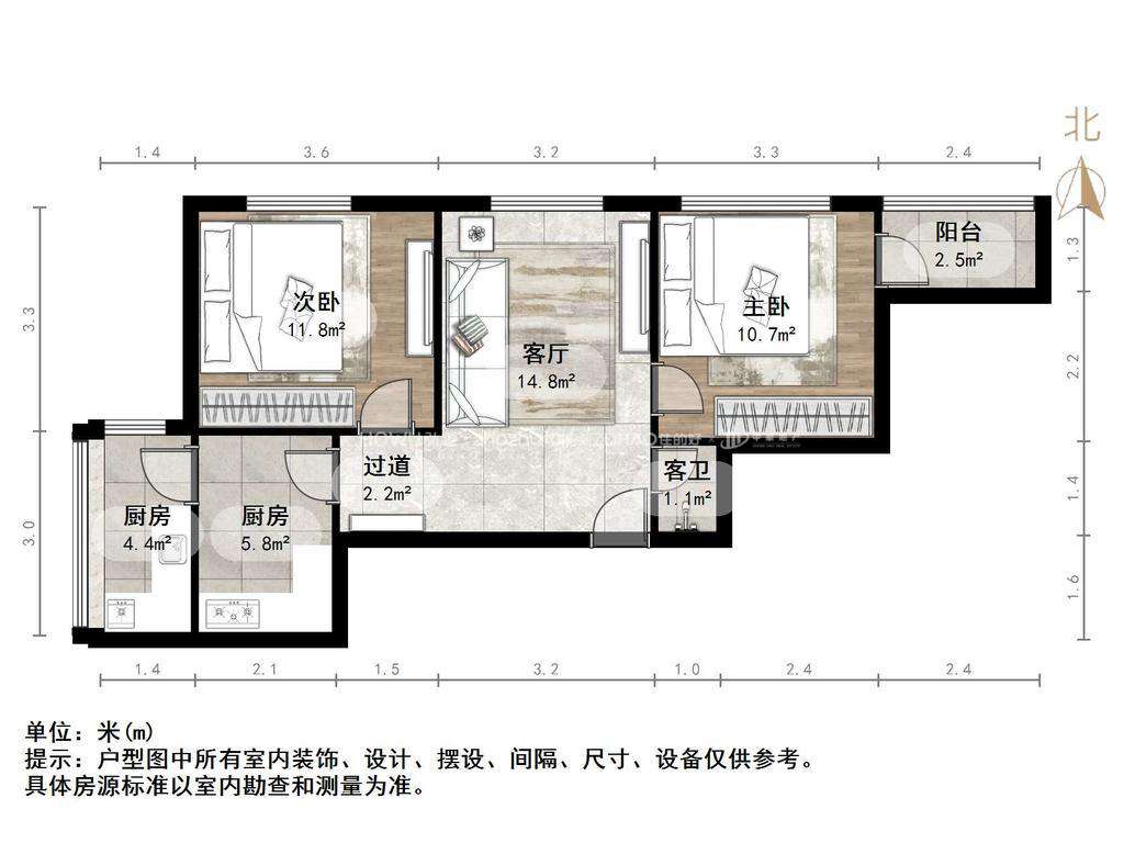 厅室2室1厅1卫1阳台