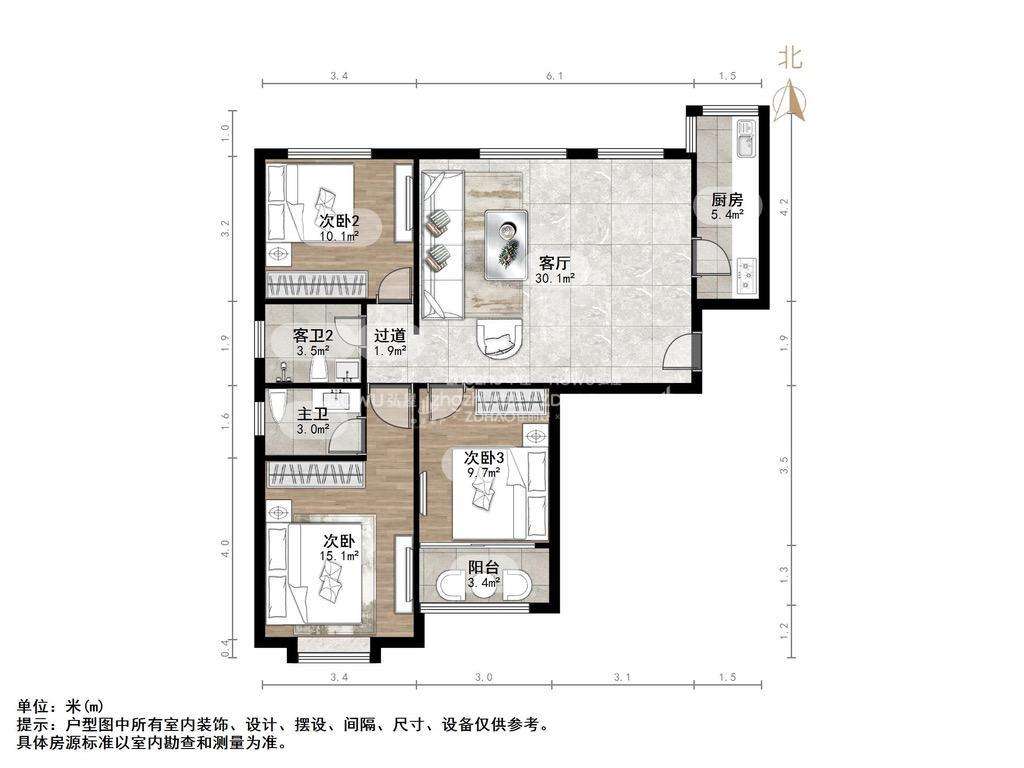 厅室3室1厅2卫1阳台