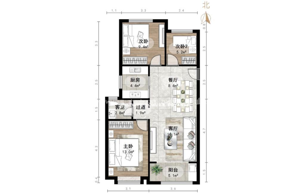 厅室3室2厅1卫1阳台