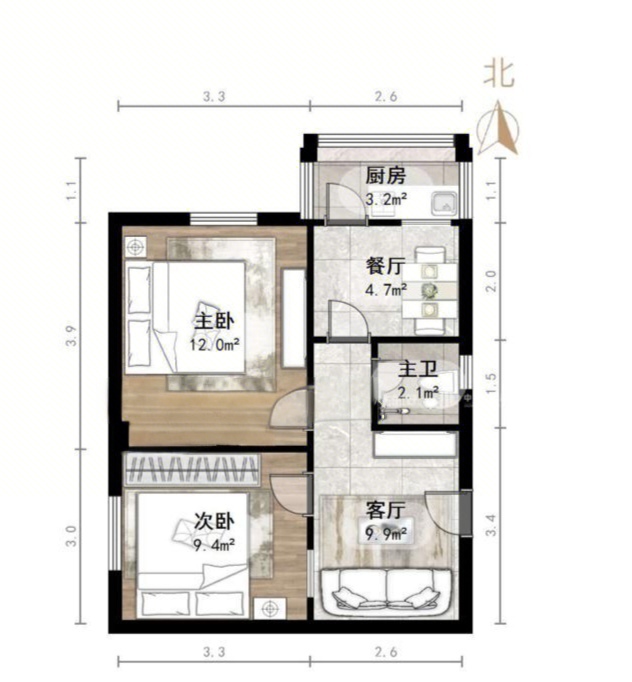 厅室2室1厅1卫1阳台
