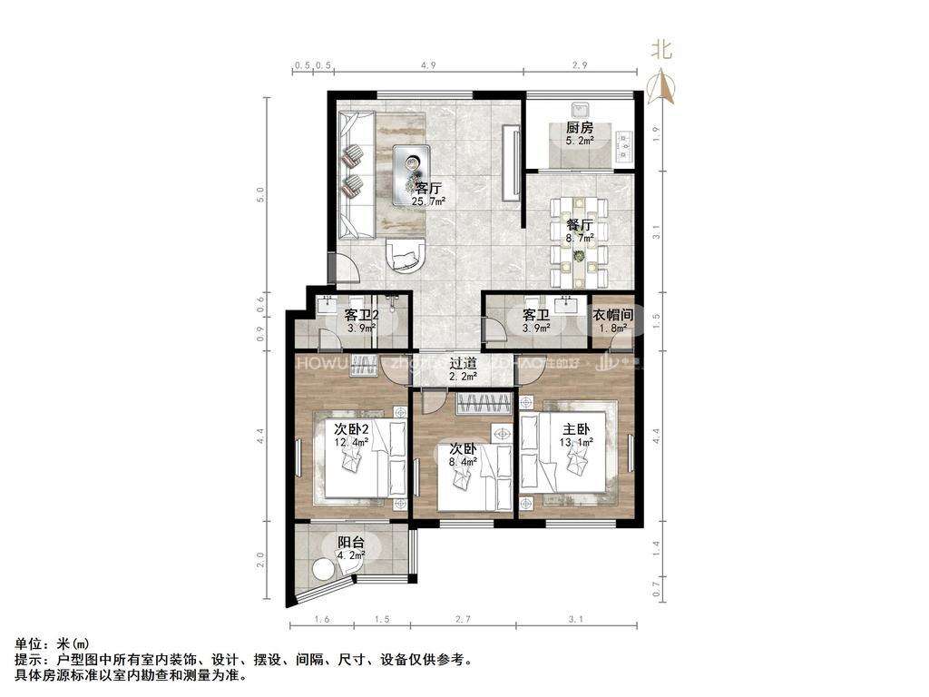 厅室3室2厅2卫1阳台