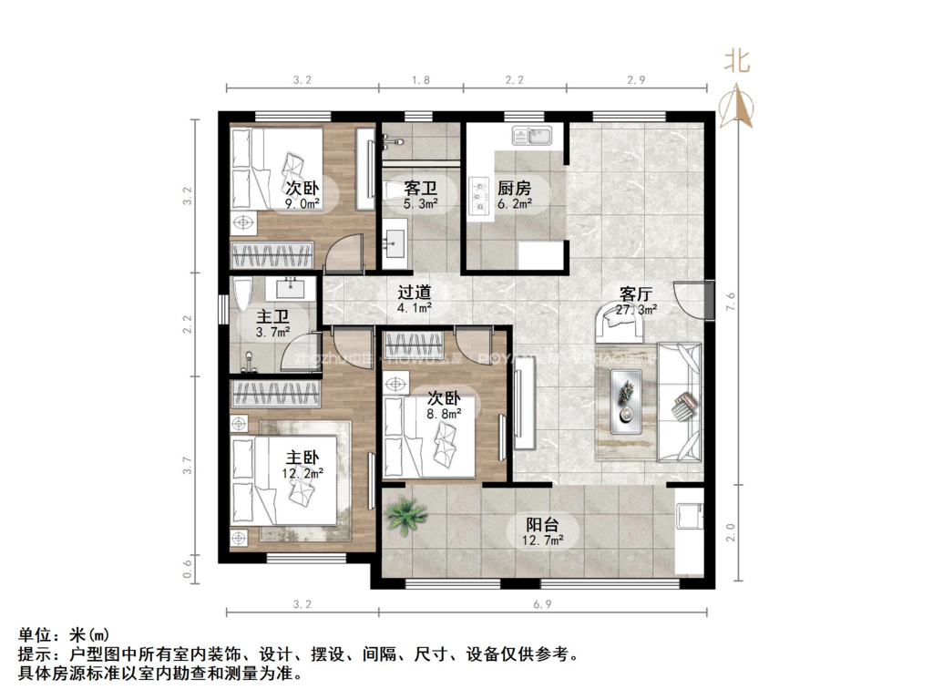 厅室3室2厅2卫1阳台