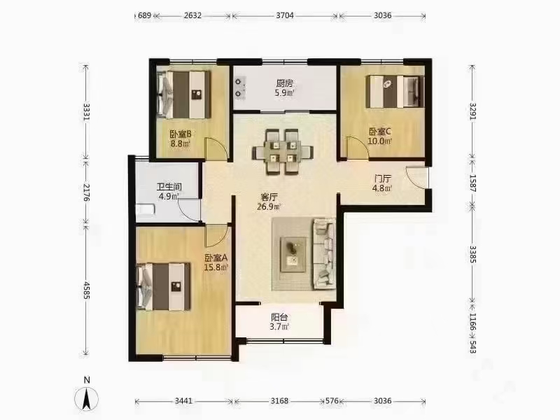 厅室3室2厅1卫1阳台