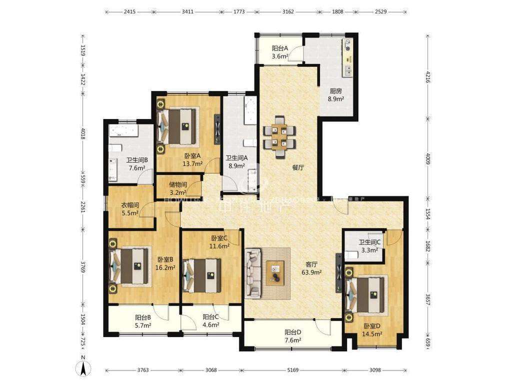 厅室4室2厅3卫0阳台
