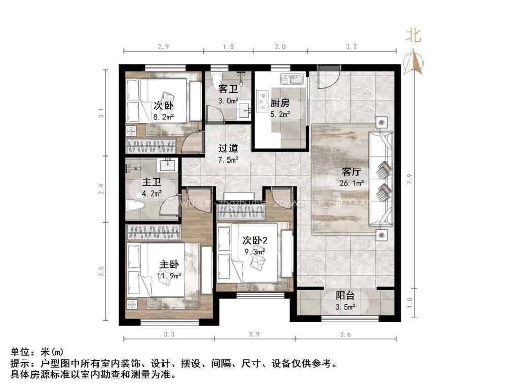 厅室3室2厅2卫1阳台