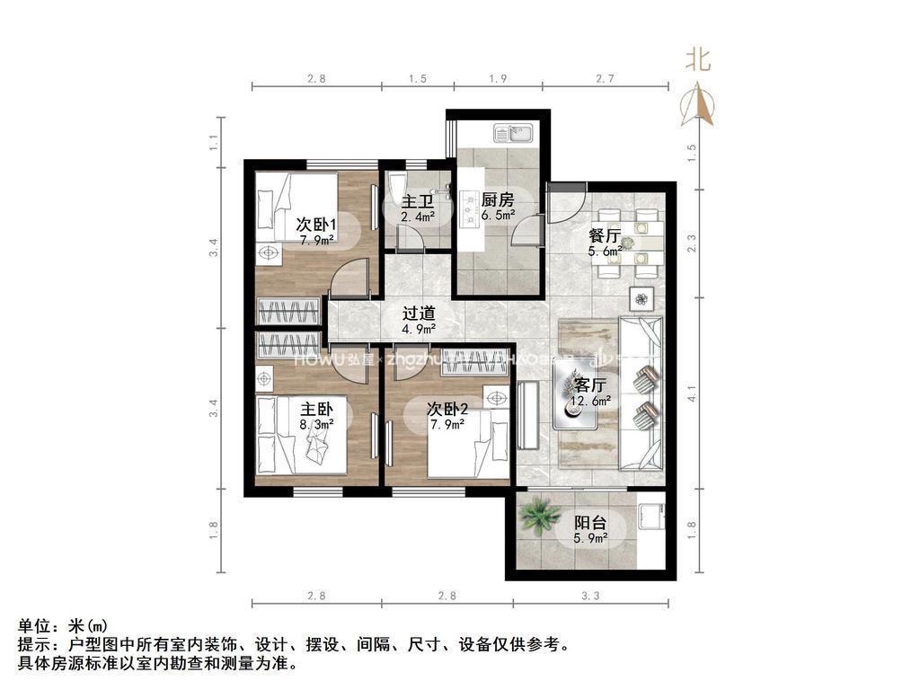 厅室3室2厅1卫1阳台