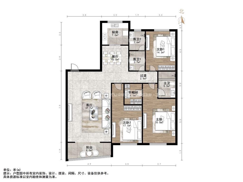 厅室3室2厅2卫1阳台