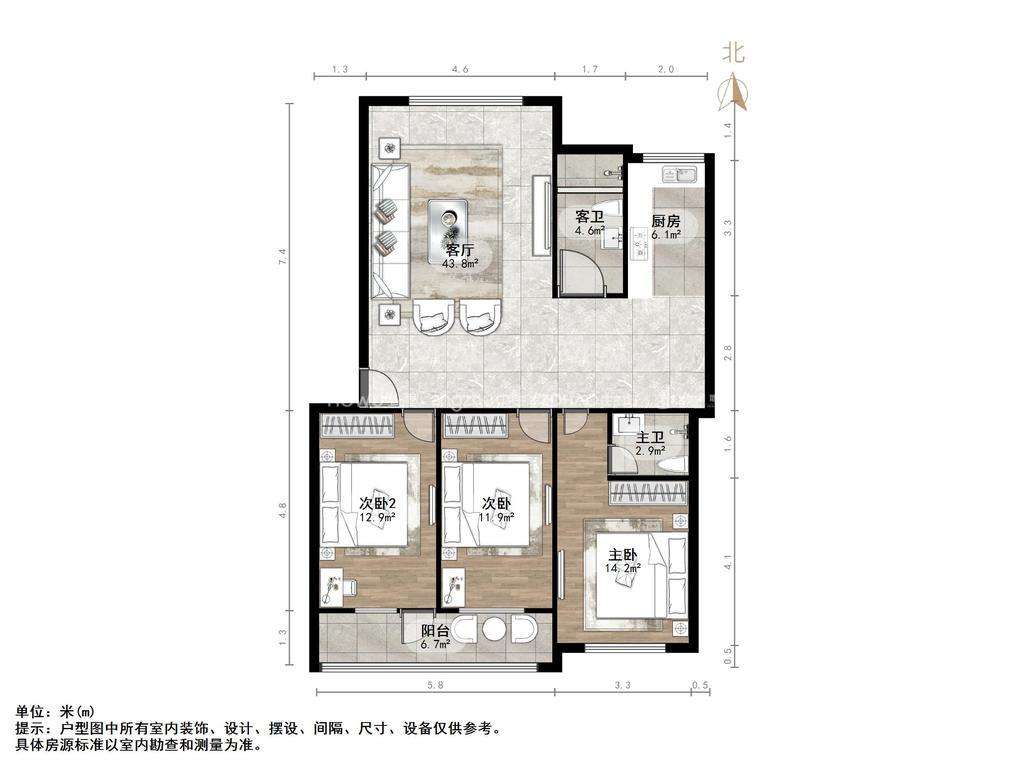 厅室3室2厅1卫1阳台