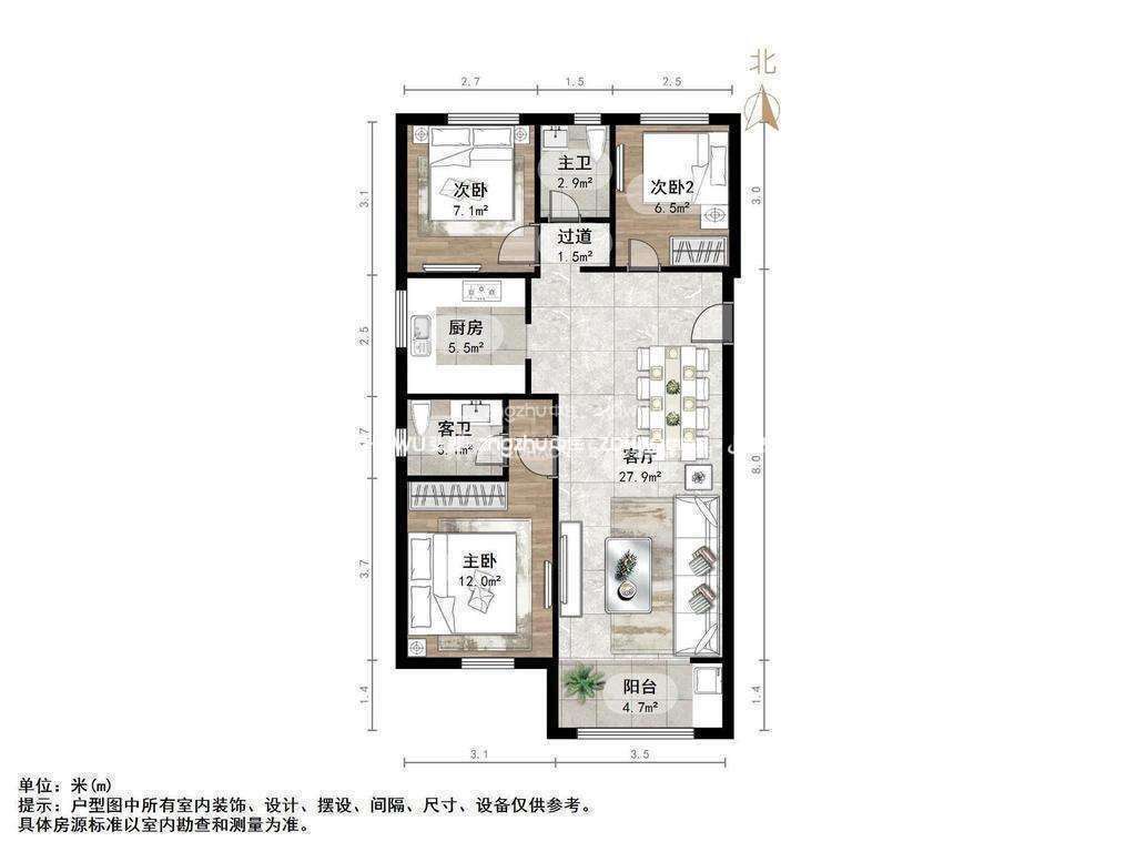 厅室3室2厅1卫1阳台