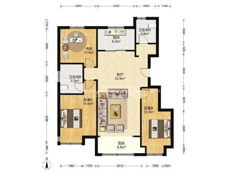 厅室3室2厅2卫1阳台