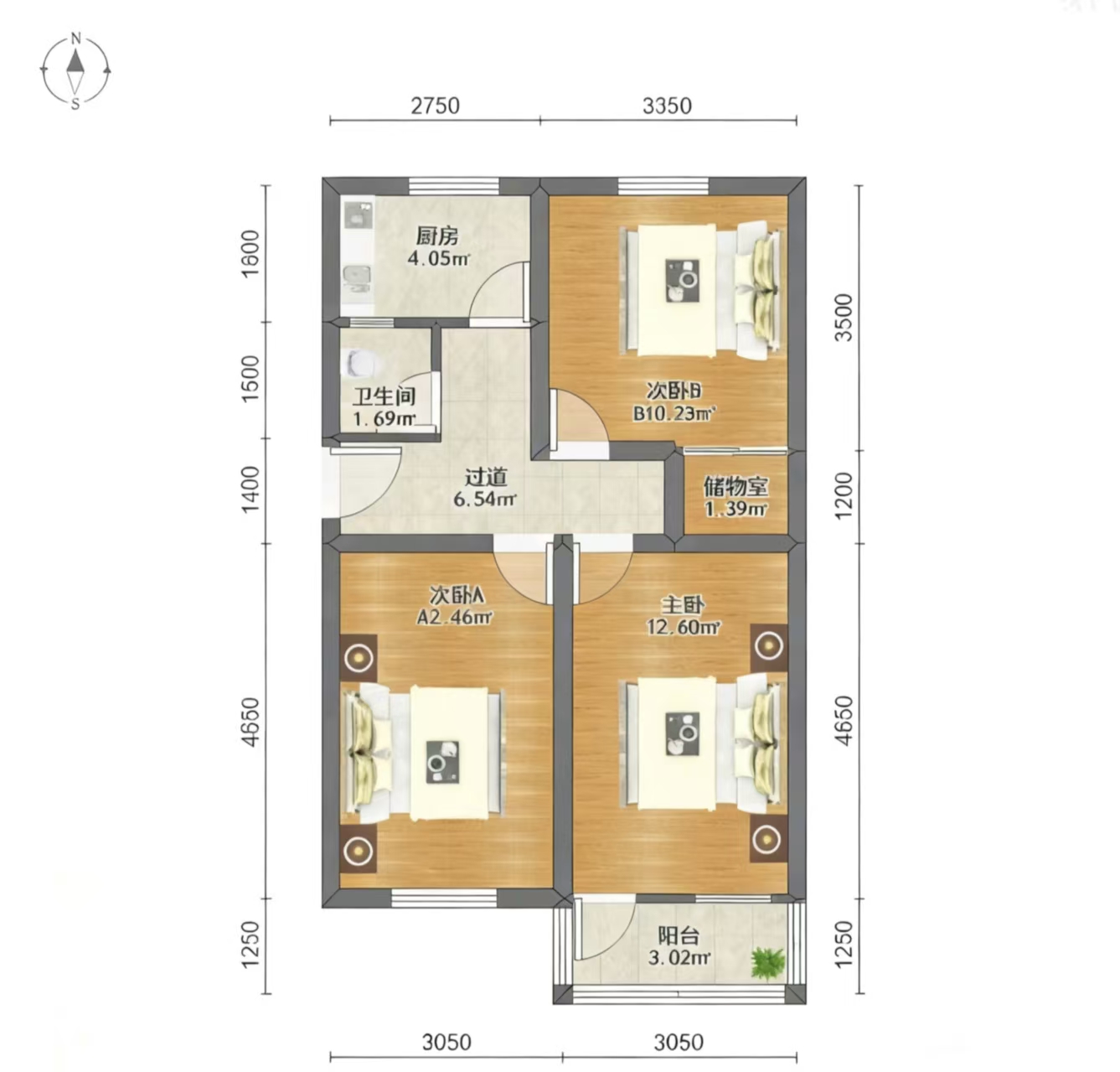 厅室3室1厅1卫1阳台