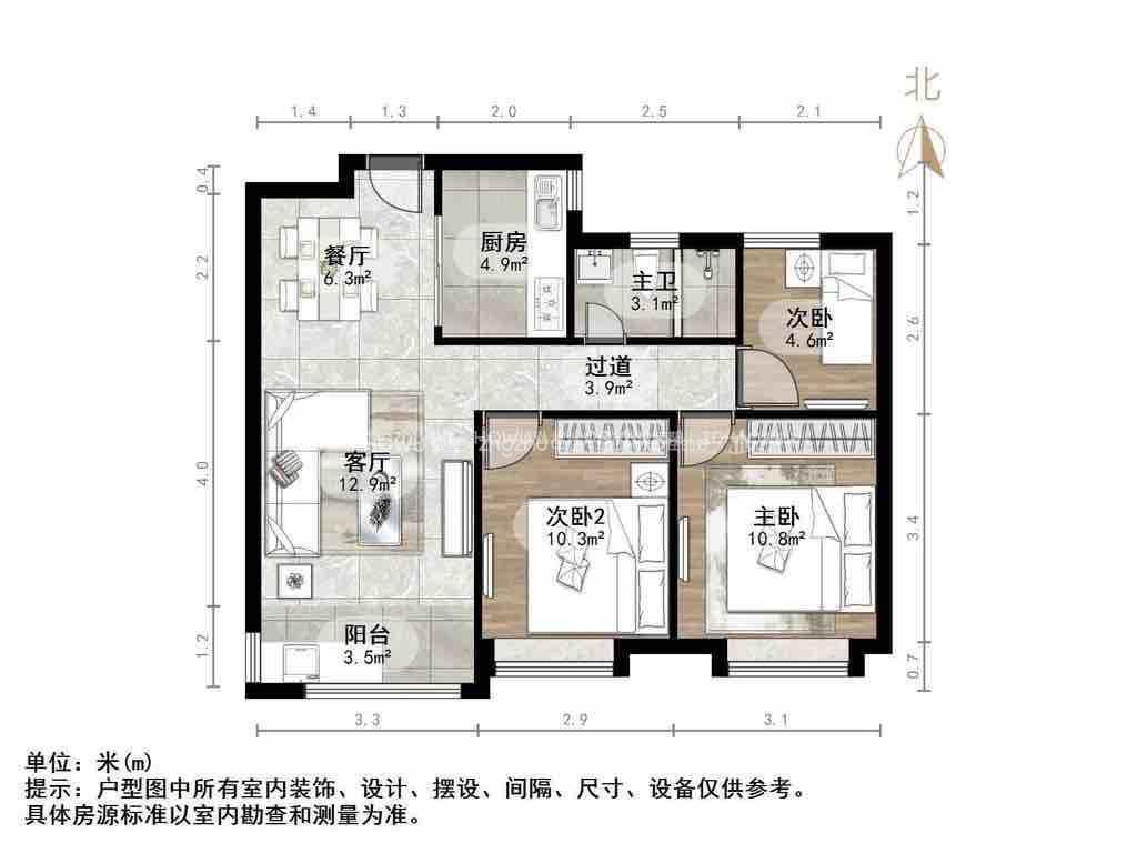 厅室3室2厅1卫1阳台