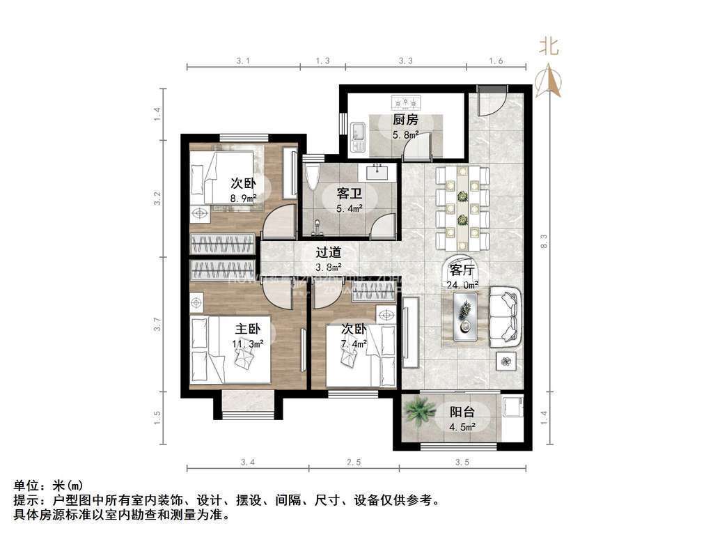 厅室3室2厅1卫1阳台