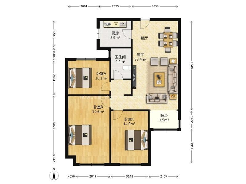 厅室3室2厅1卫1阳台