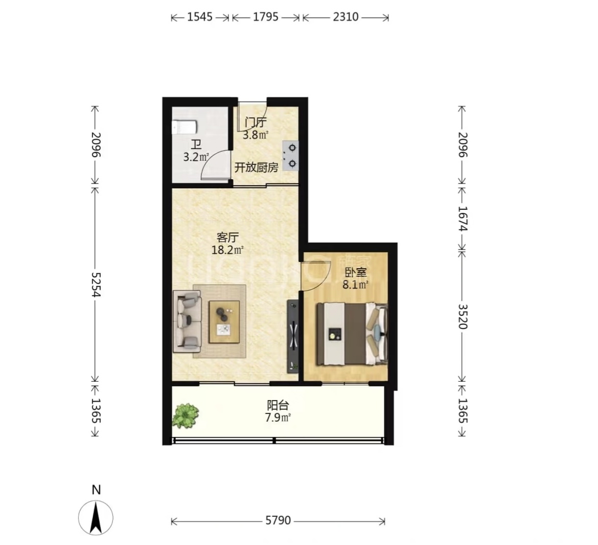 厅室1室1厅1卫1阳台