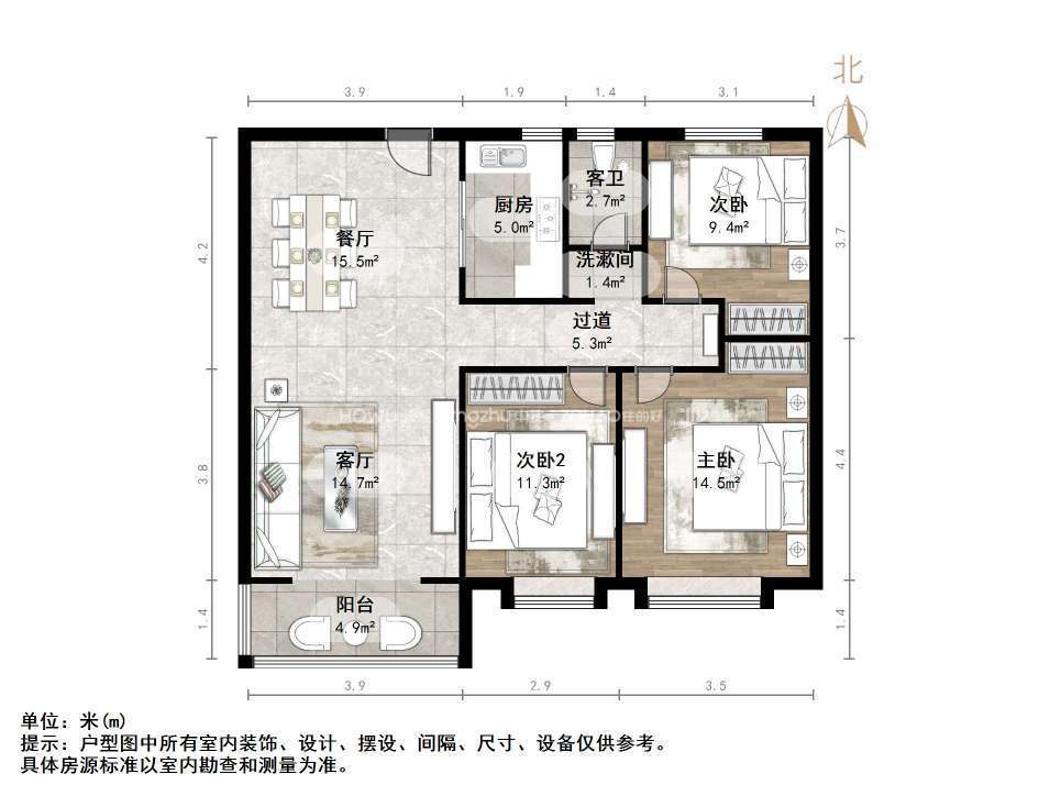 厅室3室2厅2卫1阳台