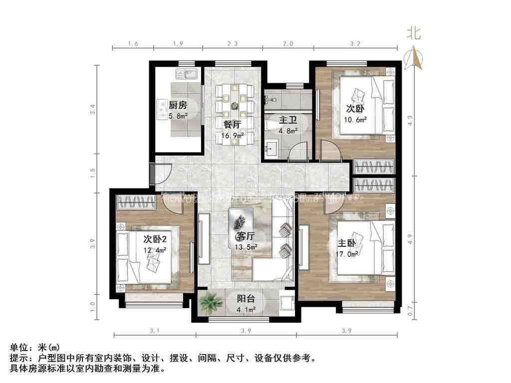 厅室3室2厅1卫1阳台