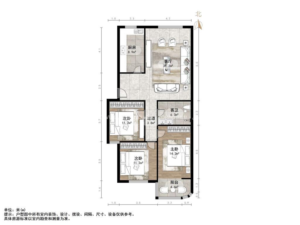 厅室3室2厅1卫1阳台