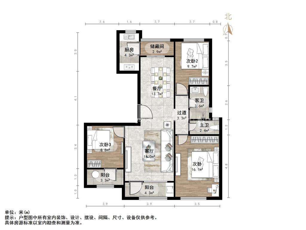 厅室3室2厅2卫1阳台