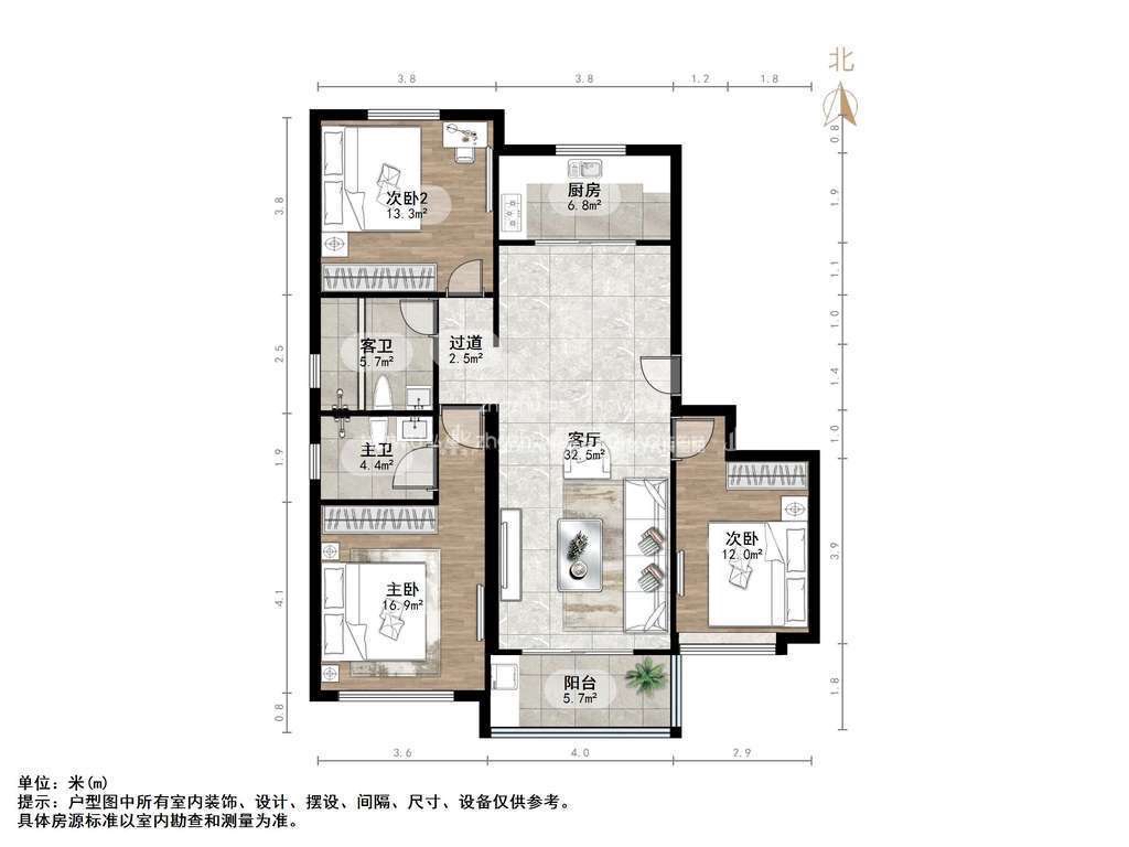 厅室3室2厅2卫1阳台