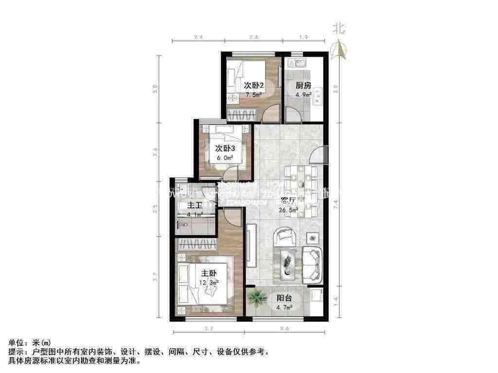 厅室3室2厅1卫1阳台