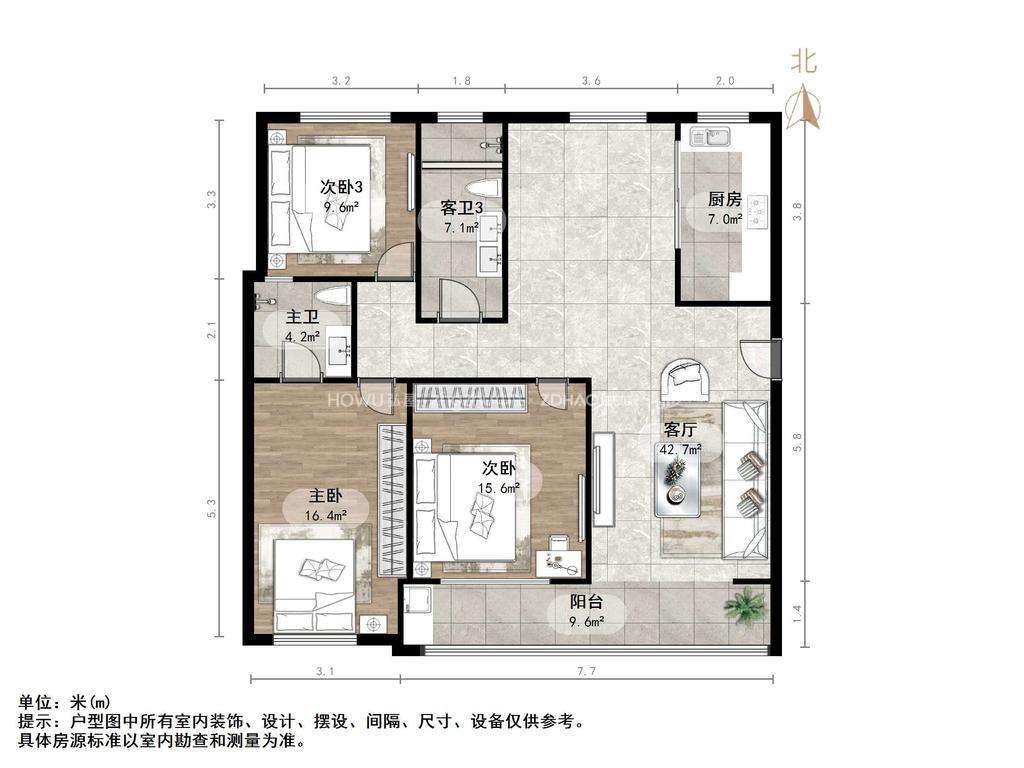 厅室3室2厅2卫3阳台