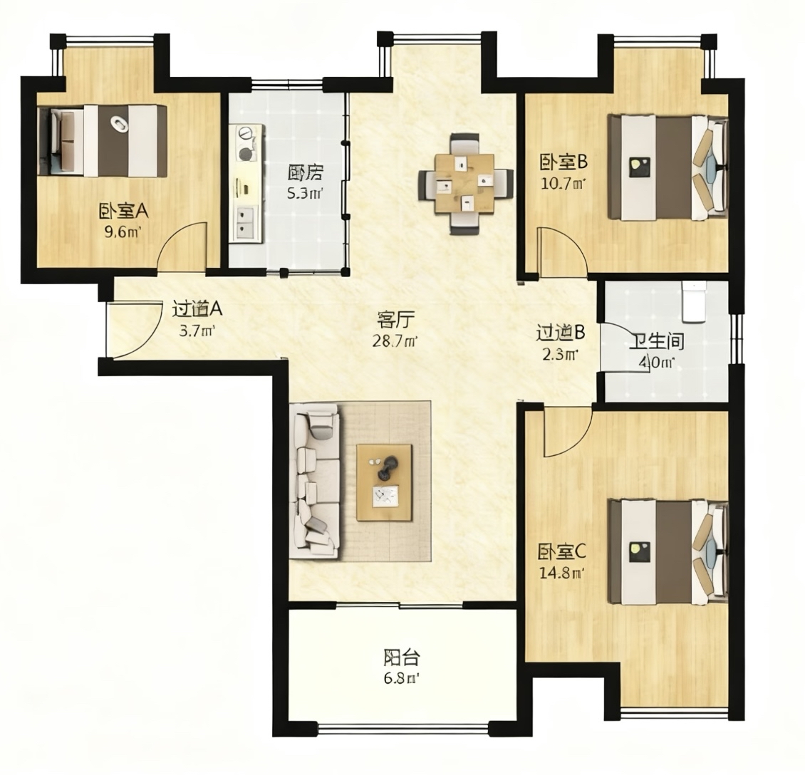 厅室3室2厅1卫1阳台