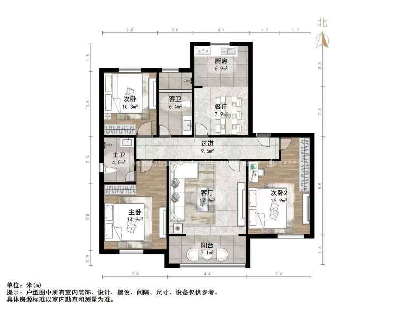 厅室3室2厅2卫1阳台