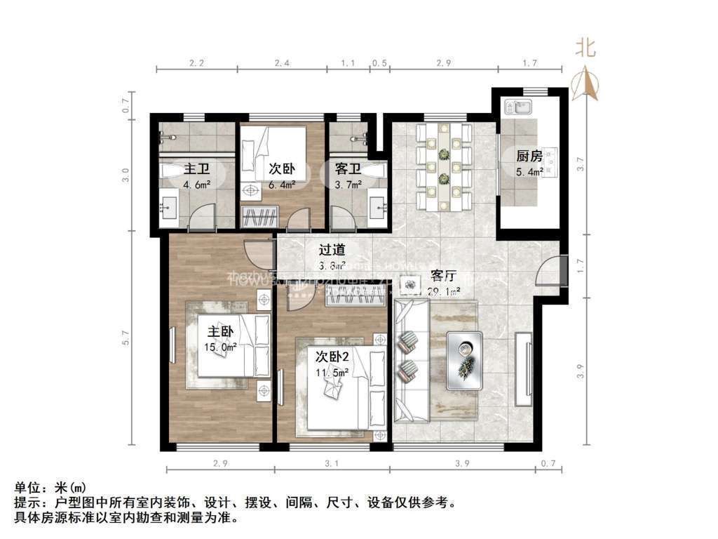 厅室3室2厅2卫1阳台