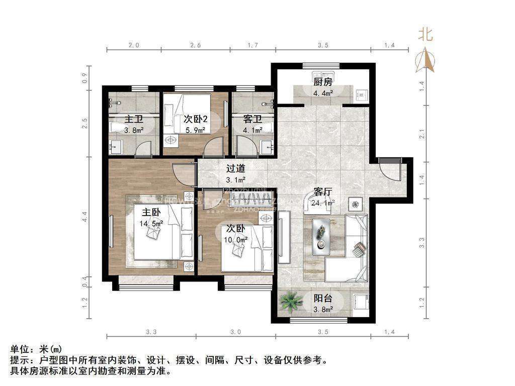厅室3室2厅2卫1阳台