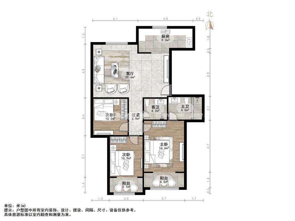 厅室3室2厅2卫1阳台