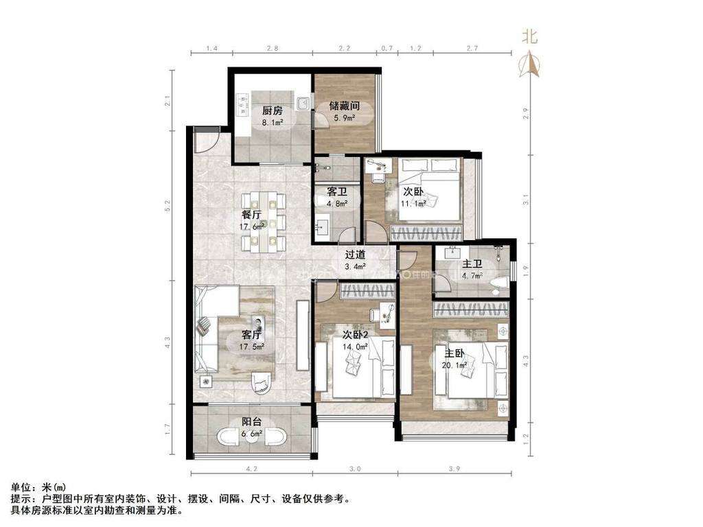 厅室3室2厅2卫1阳台