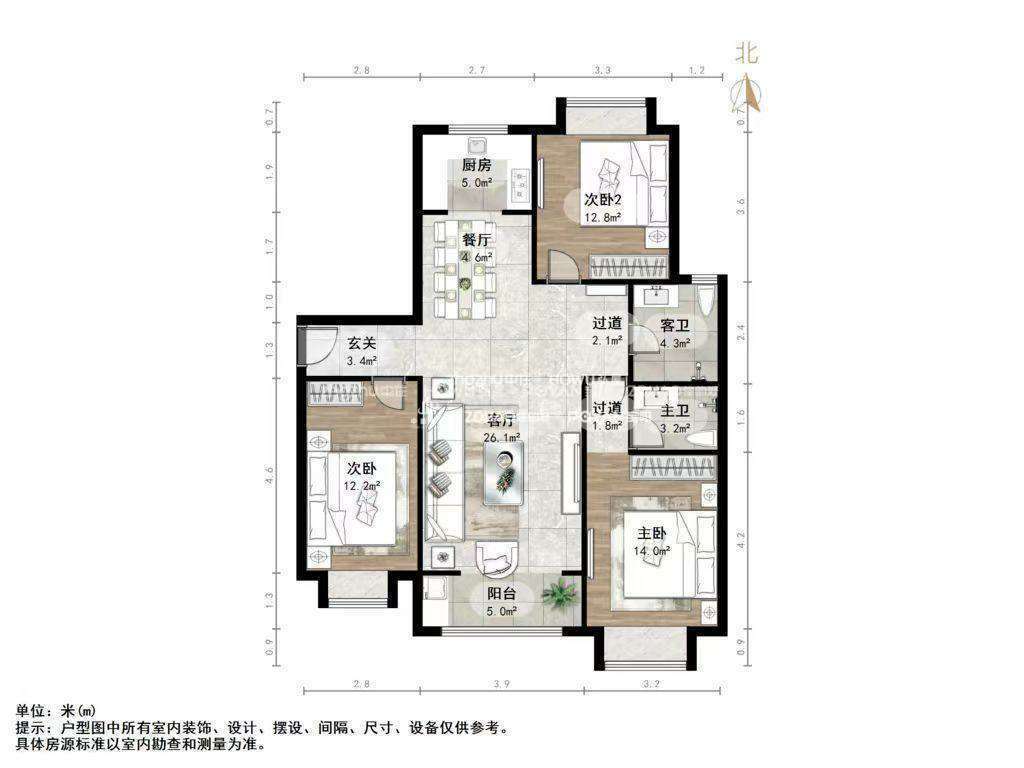 厅室3室2厅2卫1阳台