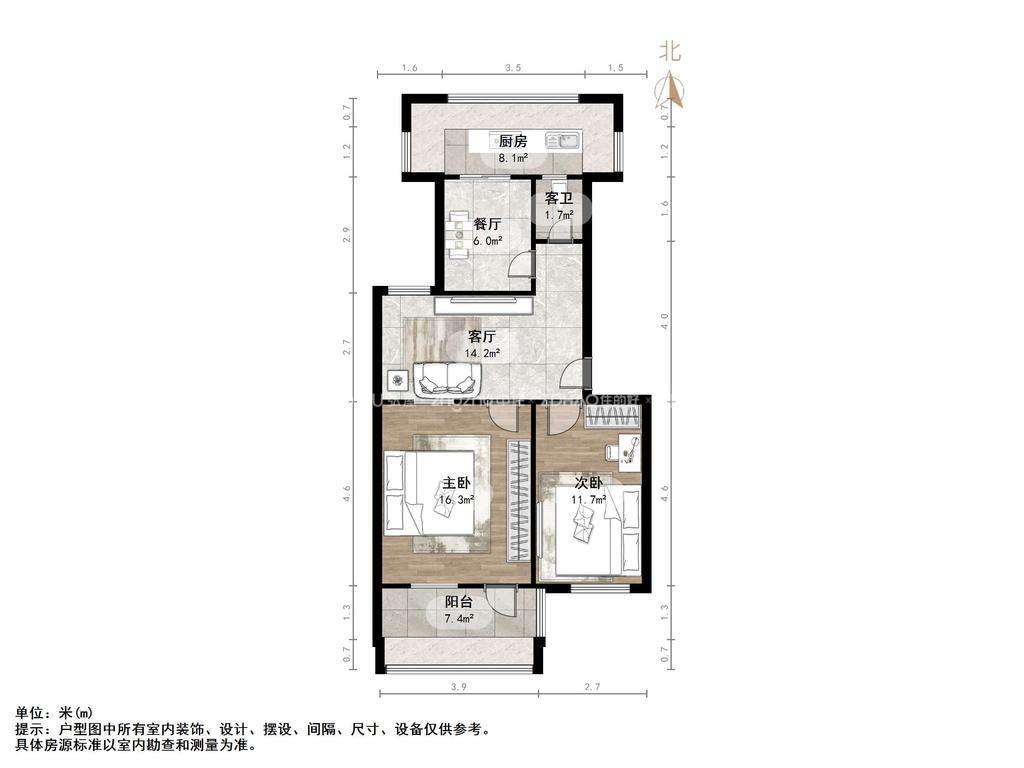 厅室2室1厅1卫1阳台