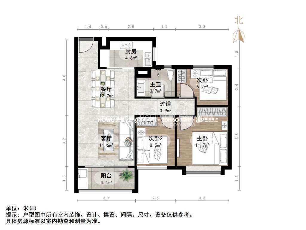 厅室3室2厅1卫1阳台