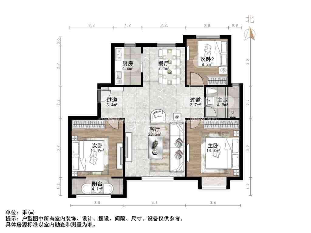 厅室3室2厅1卫1阳台