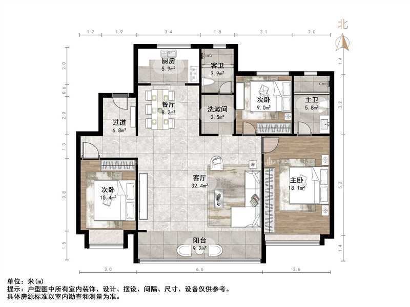 厅室3室2厅2卫1阳台