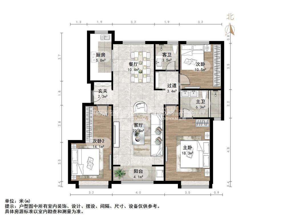 厅室3室2厅2卫1阳台