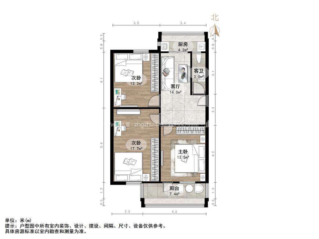 厅室3室1厅1卫2阳台