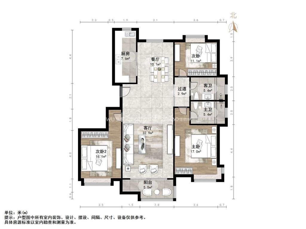 厅室3室2厅2卫1阳台
