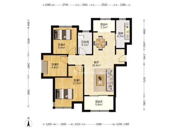 厅室3室2厅1卫1阳台