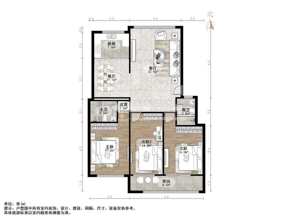 厅室3室2厅2卫1阳台