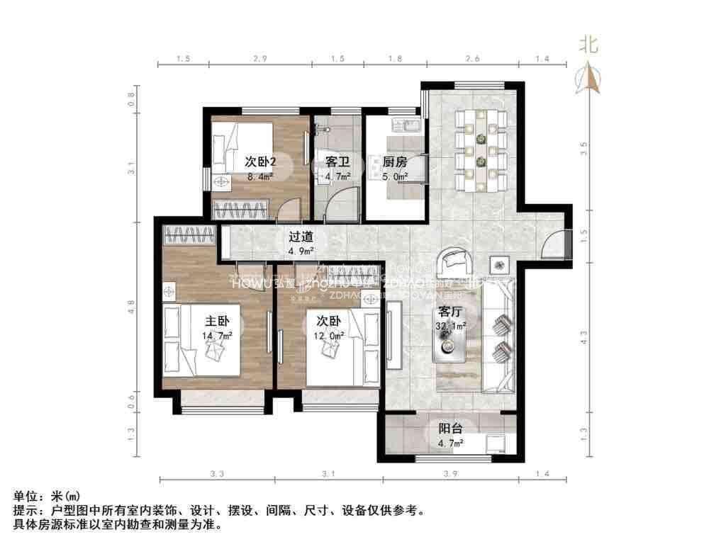厅室3室2厅1卫1阳台