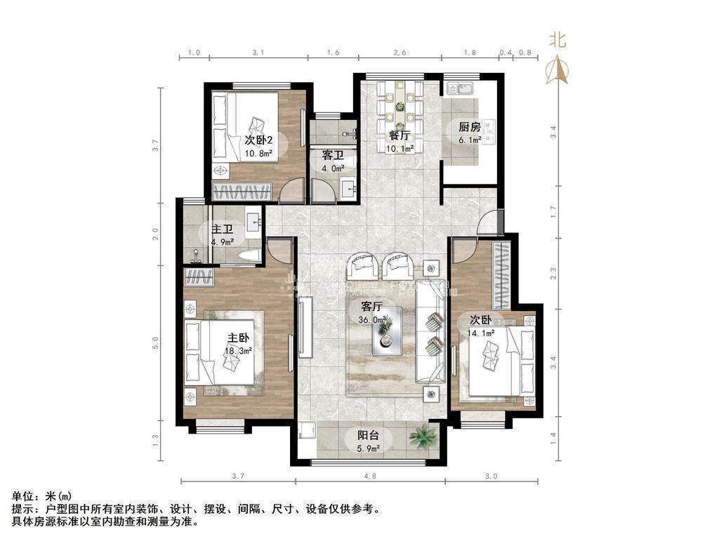 厅室3室2厅2卫1阳台