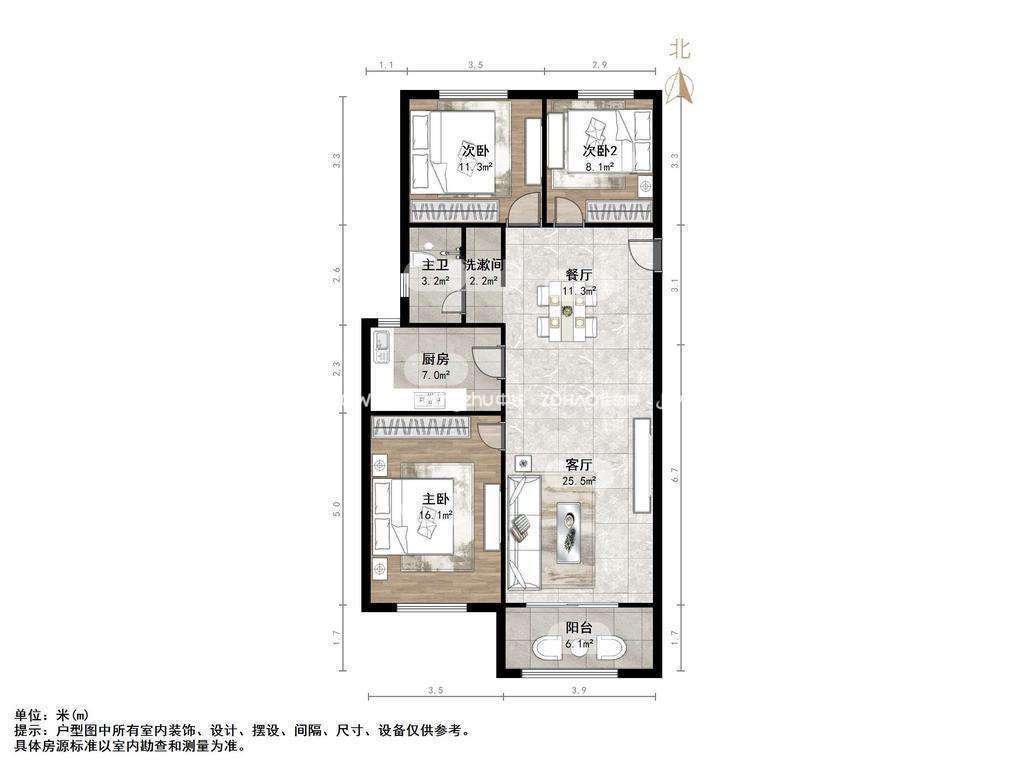 厅室3室2厅1卫1阳台