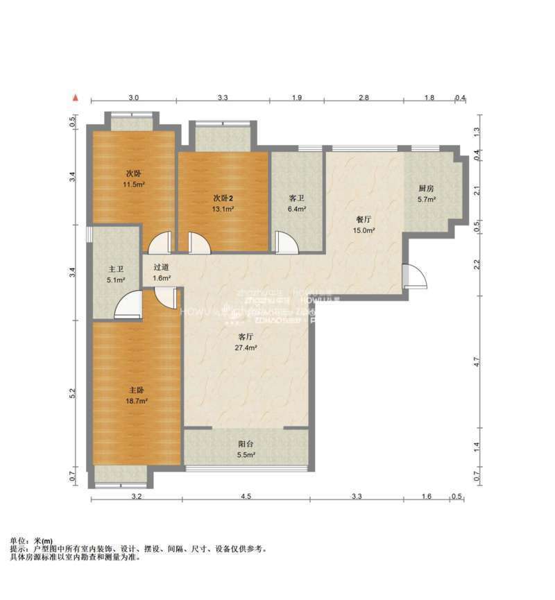 厅室3室2厅2卫1阳台