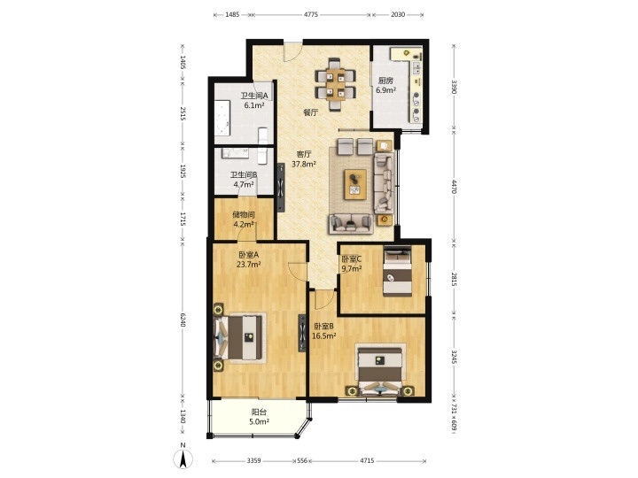 厅室3室2厅2卫1阳台